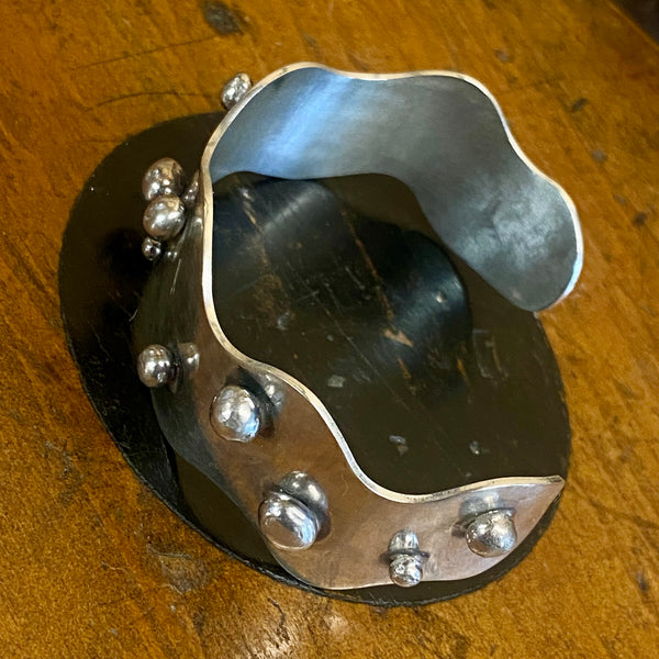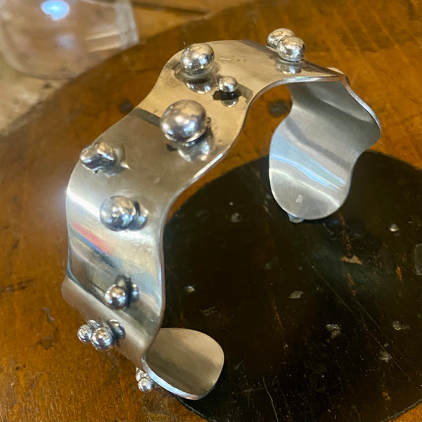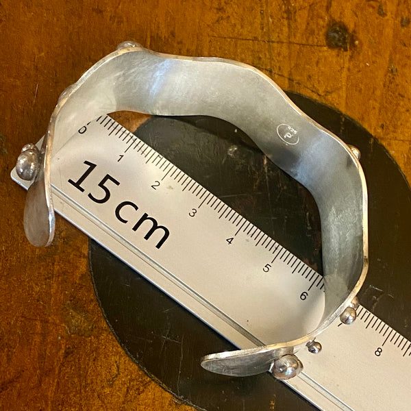 Solid sterling silver cuff in chunky 2cm wide silver in an interesting wave shape with organic bubbles of sterling silver on the surface