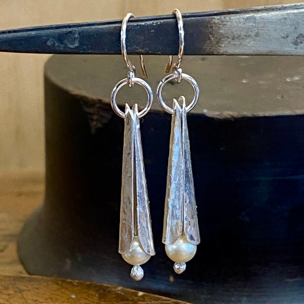 A unique earring made from hammer textured fine silver with a lovely little vintage pearl hanging on sterling silver.