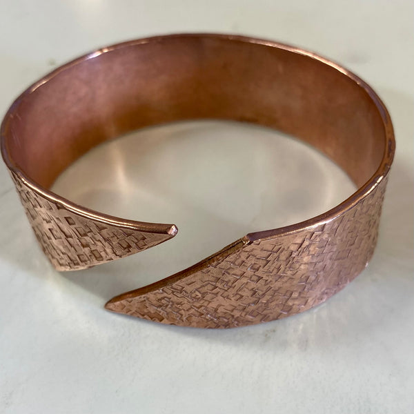 Generously sized at 7cm in diameter this chunky hammer textured copper bracelet is not quite a cuff but has a diagonal open detail making sizing really flexible and really stylish